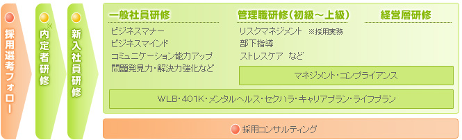 ※内定者研修: 配置部署とのマッチング、配置先社員の育成も交えるなどの包括研修にも対応可能